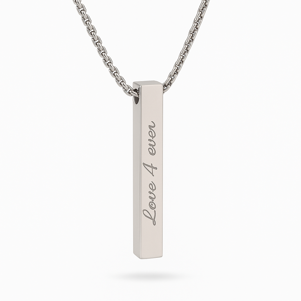 Featuring a clean vertical pendant with a smooth, high-polish finish, this piece can be engraved on up to four sides with names, dates, or coordinates. Its refined minimalism and neutral styling make it a unisex design, perfect for both men and women who appreciate understated luxury.