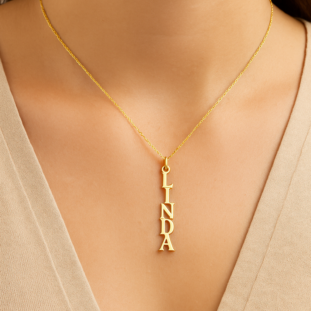 Express yourself with our Block Name Necklace – Vertical, a timeless piece designed to showcase your name or a loved one’s in bold block letters.