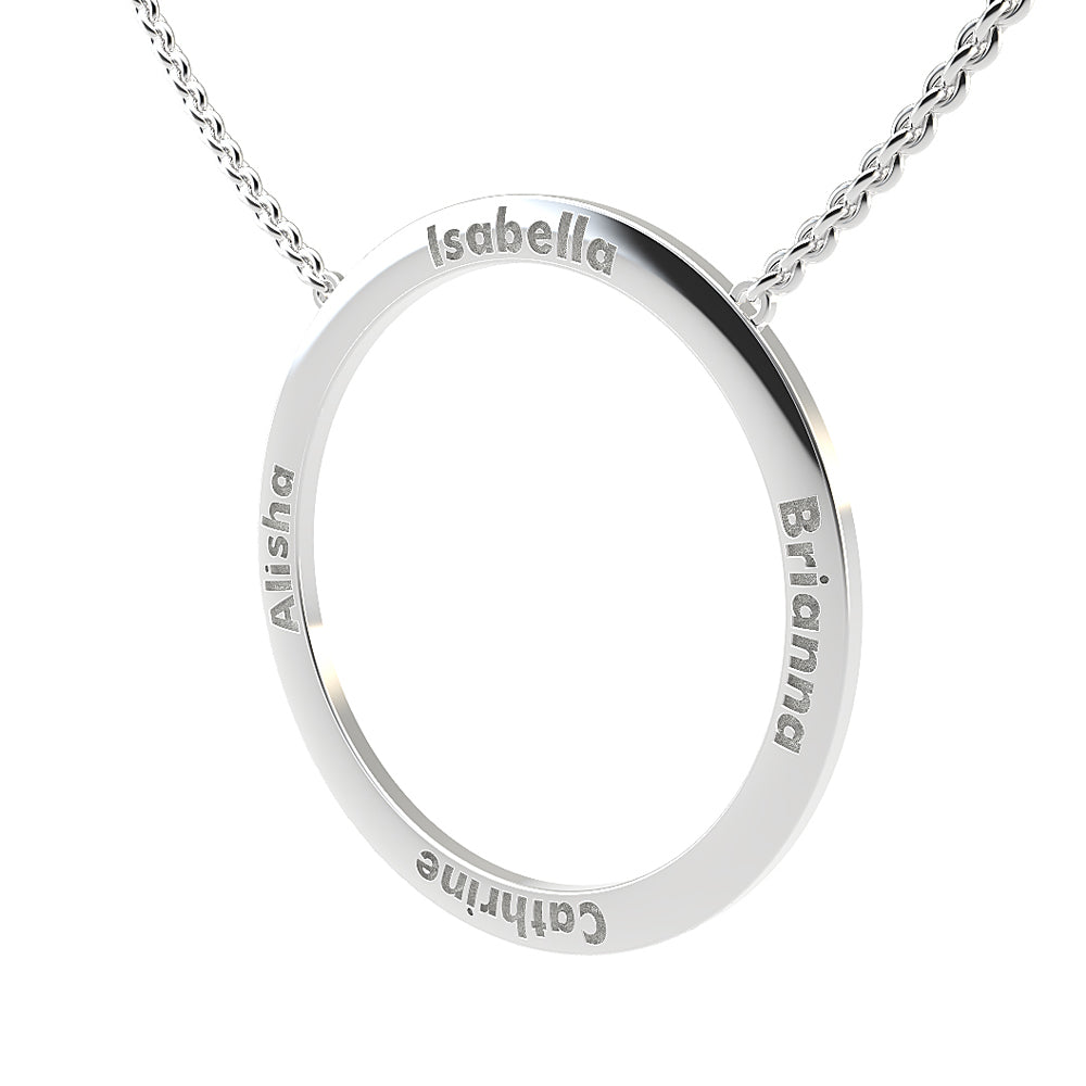 This exquisite 37mm diameter pendant is crafted and features a Single Disk Customised name design. Personalise the front with  4 engravings, with the option to engrave back with 4 engravings (additional charges).