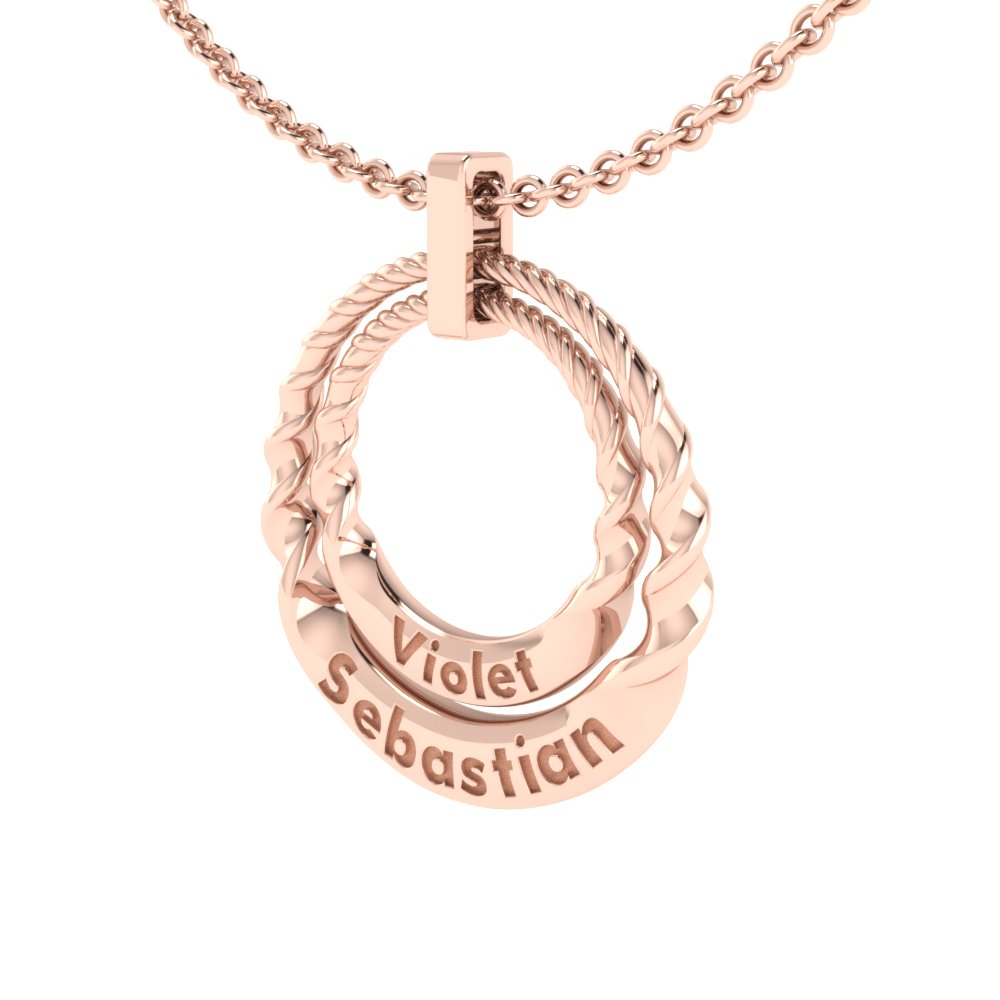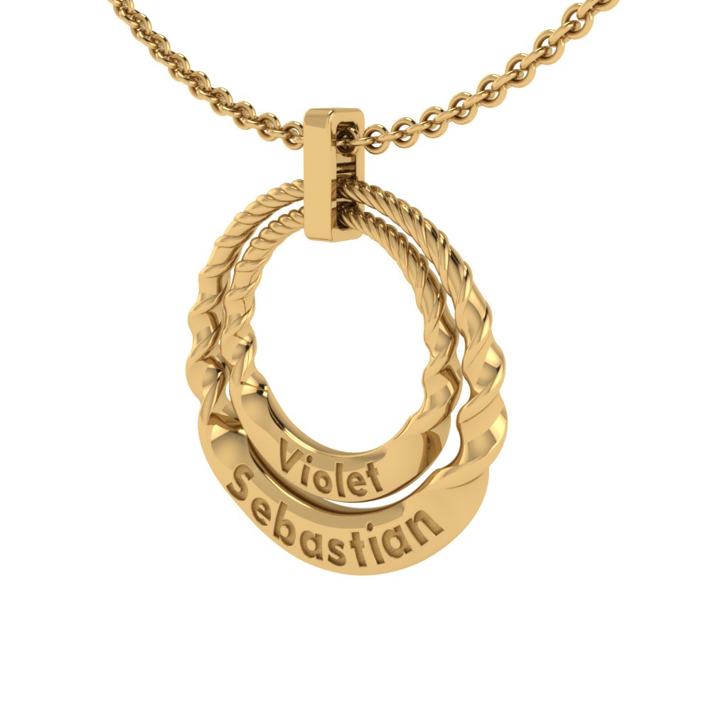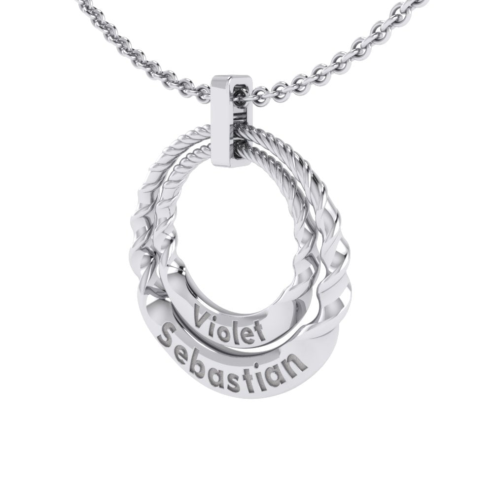 This exquisite 24mm diameter pendant is crafted and features a Double twist Disk Customised name design. Personalise the front with two engravings.