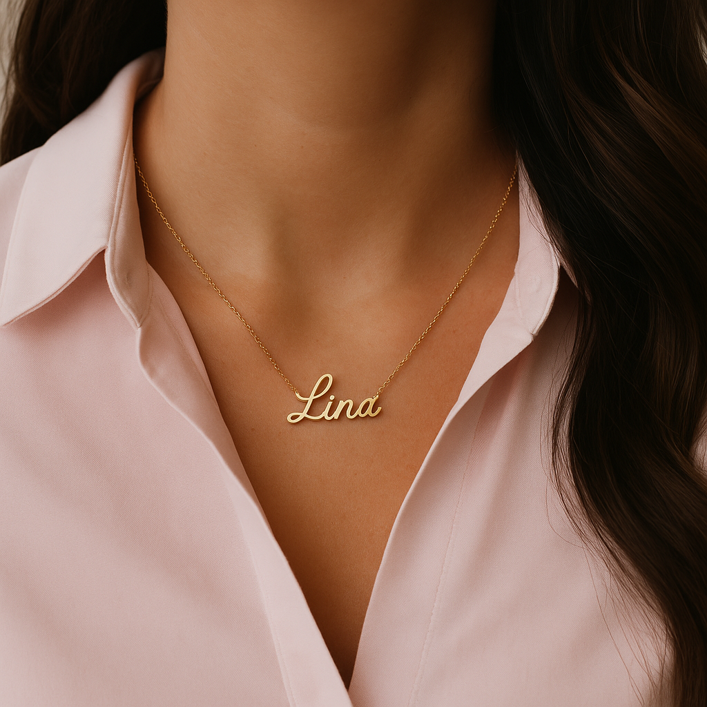 Crafted in your choice of 9ct/ 18ct Solid gold, or sterling silver with plating option, this elegant name necklace is designed to make a statement.Β